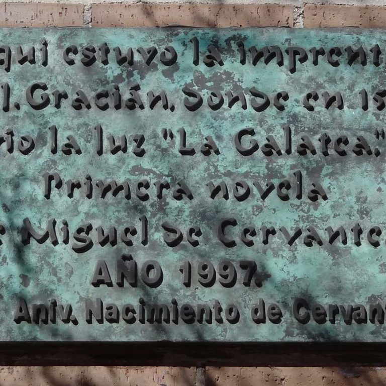Placa de bronce en recuerdo de la primera edición de la Galatea de Miguel de Cervantes, en la imprenta de Juan de Gracián, situada en el actual número 11 de la calle Libreros de Alcalá de Henares. El texto dice "Aquí estuvo la imprenta de J. Gracián, donde en 1585, vio la luz "La Galatea". Primera novela de Miguel de Cervantes.
